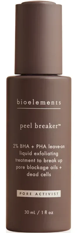 Bioelements Akne + Poreaktivister Peel Breaker – bryte opp tilstoppende oljer og døde hudceller med denne flytende leave-on-eksfoliatoren, designet for å minimere synlige porer og opprettholde en klar hud. Salisylsyre, en sebumløselig BHA, bryter ned blokkeringer i oljer, mens gluconolakton, en polyhydroksysyre, skånsomt løser opp båndene mellom døde hudceller for å eliminere ujevnheter, ru tekstur og opphopning. Formuleringen er balansert med barrierebyggende aloe vera, mjødurt, hibiskus, oregano og timian, slik at huden ser glattere og lysere ut – uten irritasjon.