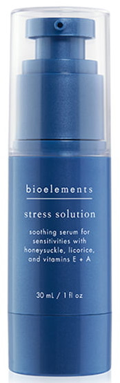 Bioelements Stress Solution er et lett serum som beskytter mot synlig irritasjon forårsaket av overdreven peeling, miljøirriterende stoffer, aggressive produkter eller kronisk overfølsomhet. Inneholder kaprifolblomst, kornblomst og lakrisrot, pluss vitamin E og A. Beroliger og kjøler stresset hud, binder fuktighet, forbedrer tekstur og hjelper huden til å se sunn og glatt ut.