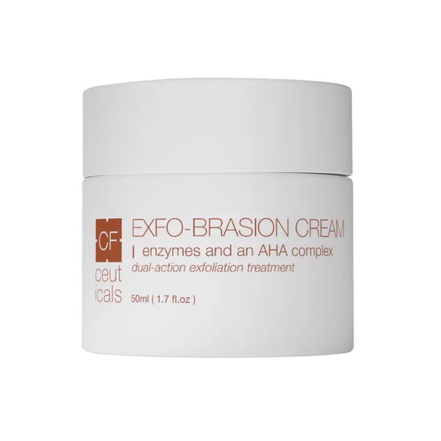 CF Ceuticals Exfo-Brasion Cream er en avansert eksfolierende krem med trippel virkning som kombinerer enzymer, AHA-syrer og skånsom mekanisk peeling for å gi en jevnere, klarere og mer strålende hud.