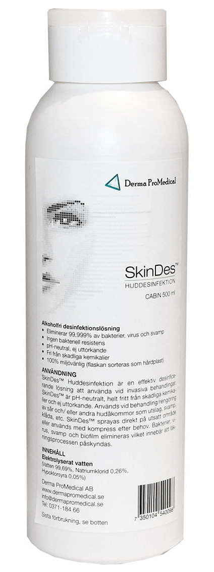 SkinDes™ er alkoholfritt og har en nøytral pH-verdi som gjør den spesielt egnet som huddesinfeksjon i en rekke avanserte behandlinger. Produktet er fullstendig giftfritt og har ingen tilsetningsstoffer. Det er miljøvennlig og kan brukes på alle hudtyper. Akselererer helbredelse og forhindrer også kløe.