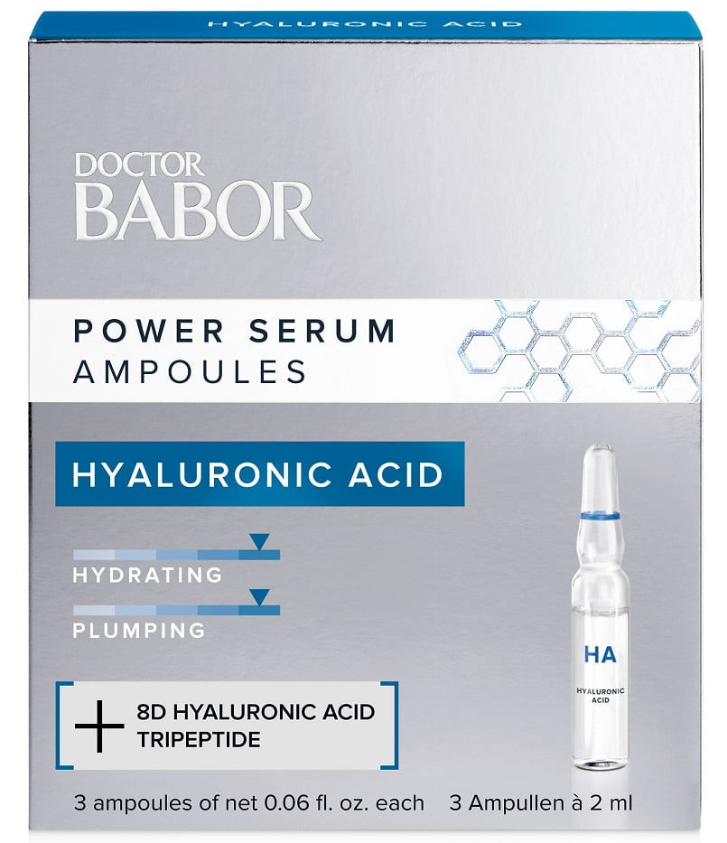 Doctor Babor Power Serum Ampoules Hyaluronic Acid kombinerer 8 forskjellige typer hyaluronsyre med et tripeptid som jobber sammen for å bidra til å stimulere hudens egen hyaluronsyreproduksjon. Ampullene bidrar til å forbedre hudens elastisitet for langvarige resultater.
