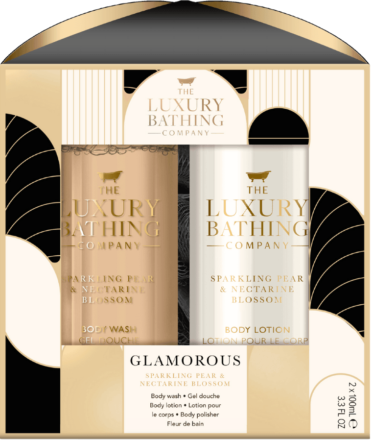 The Luxury Bathing Company Glamorous Kit Sparkling Pear & Nectarine Blossom – engelsk eleganse! En klassisk og sofistikert duft som tilbyr en sjarmerende balanse av grapefrukt, pære og appelsin med rose, kassis, en dråpe neroli og fiol som er både elegant og feminin. En treaktig base av musk, rav og sandeltre sammen med et subtilt hint av vanilje etterlater et varig inntrykk.